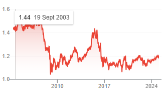 As an example someone with £200,000 on deposit would expect interest of £11,000 per annum which at, say 1.45, was producing €15,950 per annum. In the course of 12 months the £200,000 was now producing £2,000 interest and converted at 1.04 gave €2,080 per annum to spend.